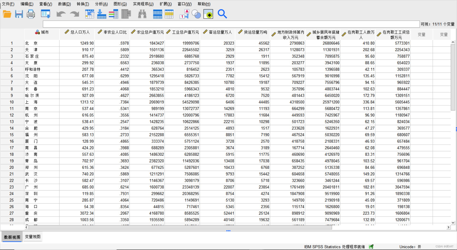 二、实验内容:运用SPSS应用软件中的相关的模块,利用表3中的数据,针对中国主要城市影响经济发展的主要指标进行主成分分析。