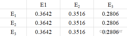 3、状态概率行向量的计算(马尔可夫预测法)。由原始数据可知,最新一年(2004年)的收成状态为E2,因此设置2004年的农业收成状态为[0,1,0],将此矩阵与2004年的状态转移概率矩阵相乘,得到下一年份的状态概率,依此计算,可得到2030年的状态概率。