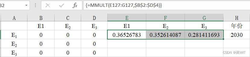 2、转移概率矩阵的自乘运算。通过选定单元格,利用“MMULT()”函数逐步进行矩阵的自乘运算,直到出现稳定分布为止。