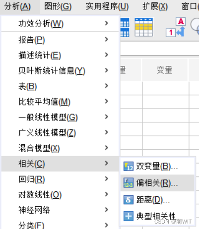 4、计算偏相关系数。点击“分析”→“相关”→“偏相关”,展开偏相关性分析对话框。
