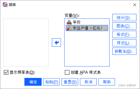 3、进行统计分析。打开“分析”→“描述性分析”→“频率”,
