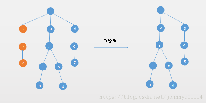 如果单词的所有字母的都没有多个分支(也就是说该单词所有的字符对应的Node都只有一个子节点),则删除整个单词。