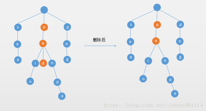 如果待删除的单词是另一个单词的前缀,只需要把该单词的最后一个节点的 isWord 的改成false,比如Trie中存在 panda 和 pan 这两个单词,删除 pan ,只需要把字符 n 对应的节点的 isWord 改成 false 即可。