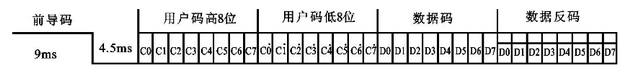 9ms高电平接着4.5ms低电平,标志数据帧的开始 - 用户码(共16位)为红外接收器识别遥控器的身份的标志,不同的遥控器一般用户码不同,以防止不同电器设备之间遥控码的干扰