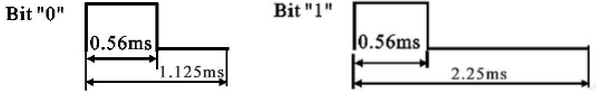 0.56ms间隔0.565ms周期1.125ms表示二进制0;以脉宽0.56ms间隔1.69ms周期2.25ms表示二进制1