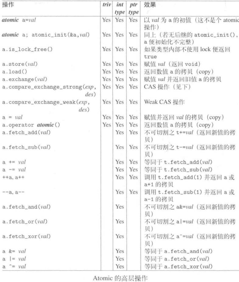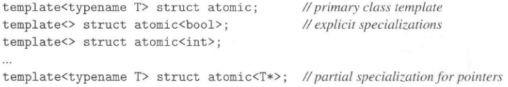 - atomic<>是一个模板,可以适用于任何一般类型上。另外特化版本针对于bool、所有整数类型以及pointer:
