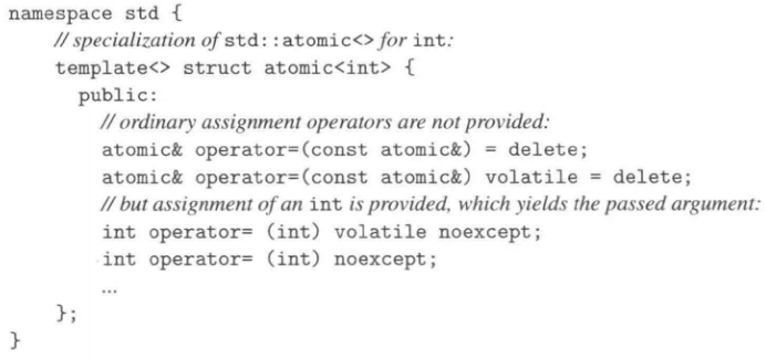 - 所有函数,除了构造函数,都被重载为volatile和non-volatile两个版本。例如,atomic<int>之内声明了以下的赋值操作