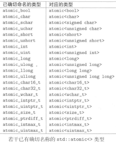 - 下图列出了最重要的atomic类型名称,除此之外还有更多,适用于较不常见的类型,例如atomic_int_fast32_t乃是针对atomic<int_fast32_t>类型的