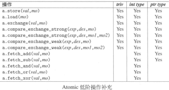 - triv列表示:针对std::atomic<bool>及“其他普通类型之atomic”提供的操作