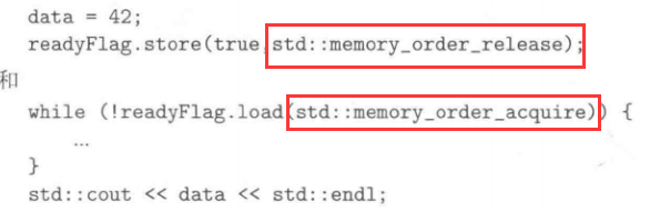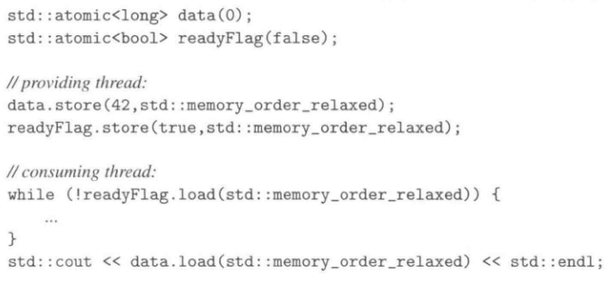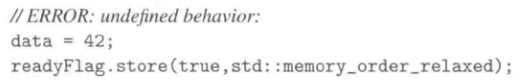- 严格来说,这并非不明确行为,因为我们并未遭遇data race。然而这却也难以预期般地运行,因为data的结果值有可能(尚未)不是42(memory order对此仍无保证)。其行为会导致data拥有一个无法具体说明的值