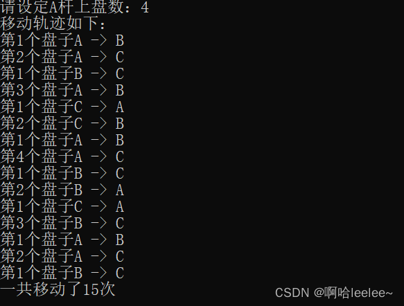 4、当A杆有四个盘子时,移动轨迹如下:第一个盘子A->B;第二个盘子A->C;第一个盘子B->C;第三个盘子A->B;第一个盘子C->A;第二个盘子C->B;第一个盘子A->B;第四个盘子A->C;第一个盘子B->C;第二个盘子B->A;第一个盘子C->A;第三个盘子B->C;第一个盘子A->B;第二个盘子A->C;第一个盘子B->C。