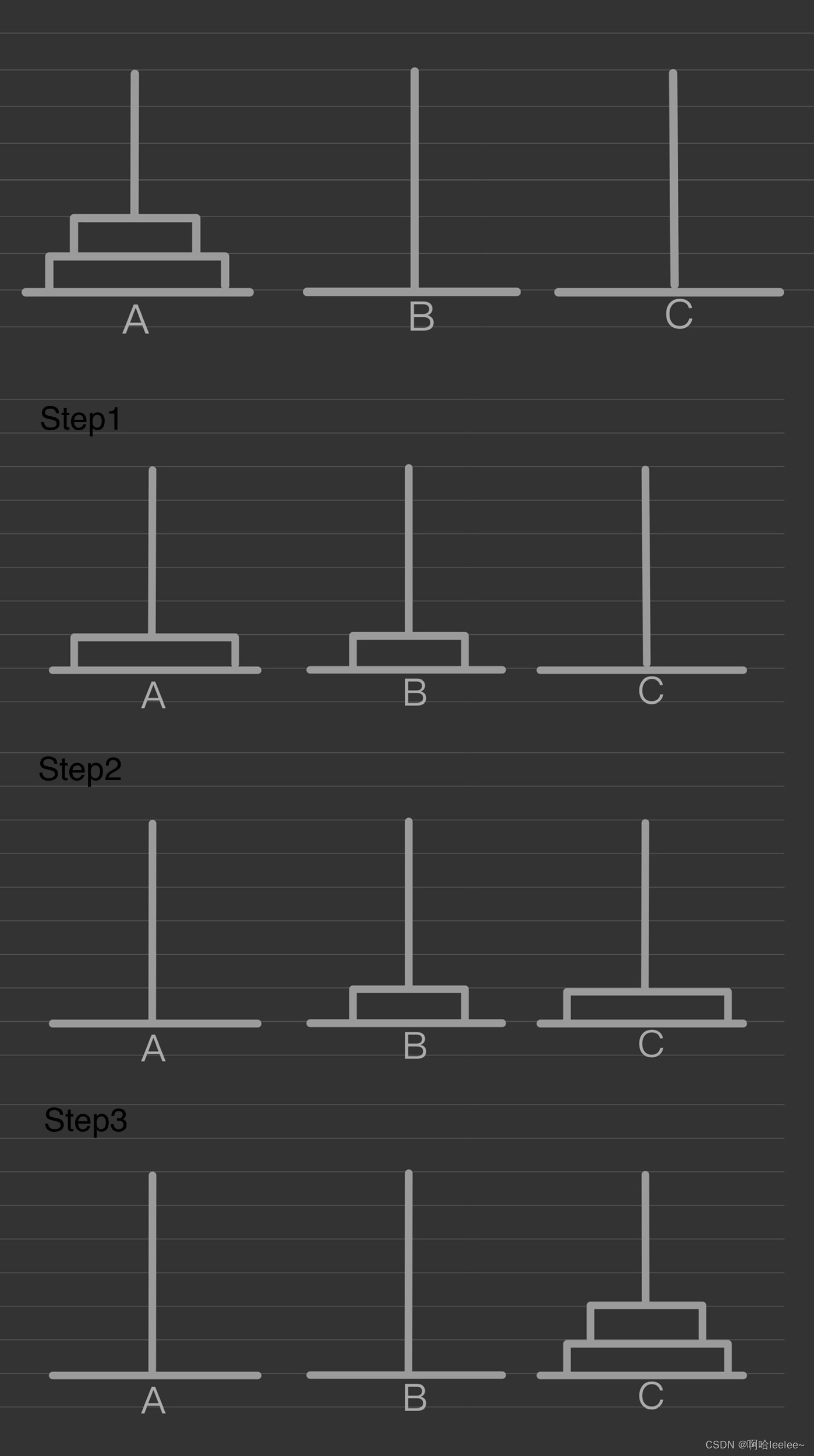 2、当A杆有两个盘子时,运动轨迹如下:第一个盘子A->B;第二个盘子A->C;第一个盘子B->C。
