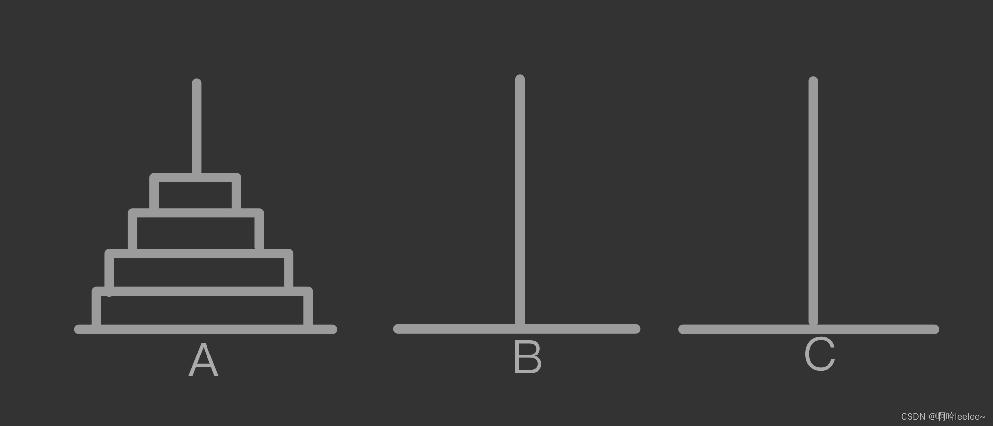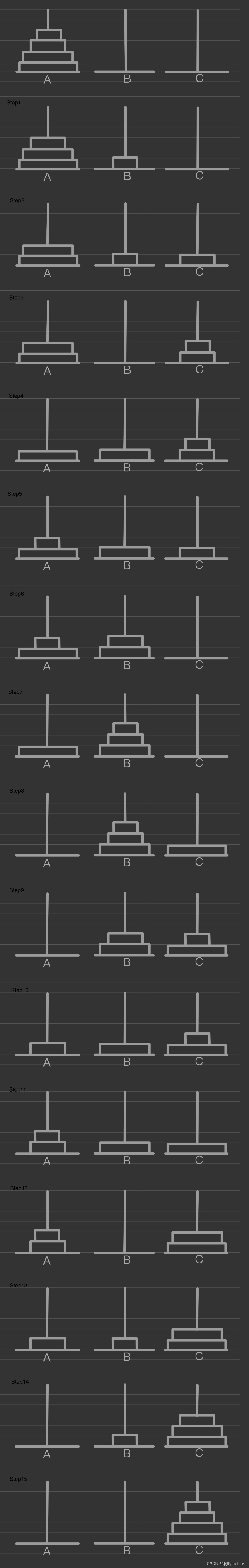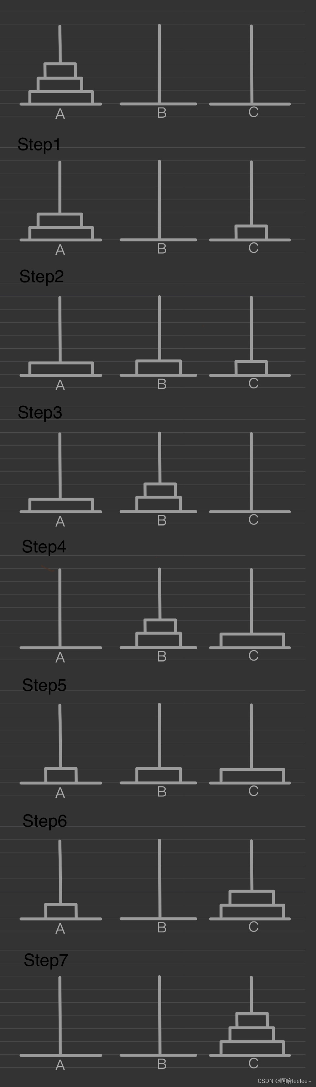 void Hanoi(int n, char A, char B, char C) //n个盘子,从A杆移到C杆,B作为中介