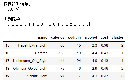 KMeans聚类理解起来还是比较容易的,在这里使用一个简单的啤酒数据集进行演示说明。该数据集包括20个样本数据,5个数据特征(品牌,热量,含钠量,酒精量,成本),在聚类时只使用后4个数值特征。
