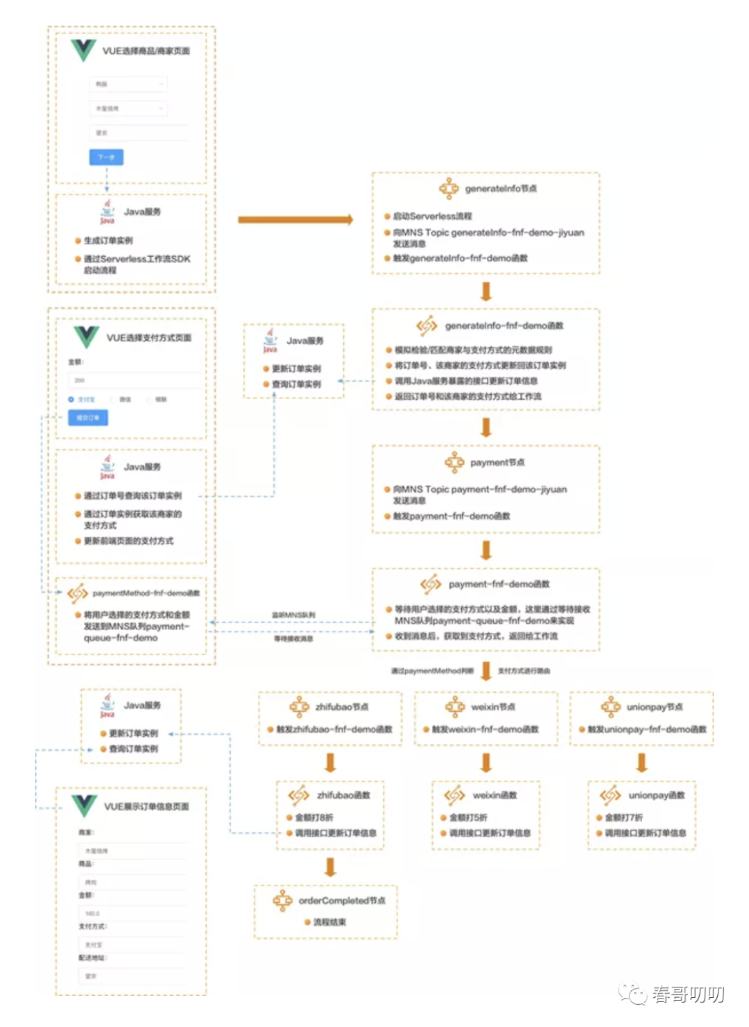 以上是一个基于Serverless的fc实现的工作流,模拟构建了一个订单模块,规则包括: