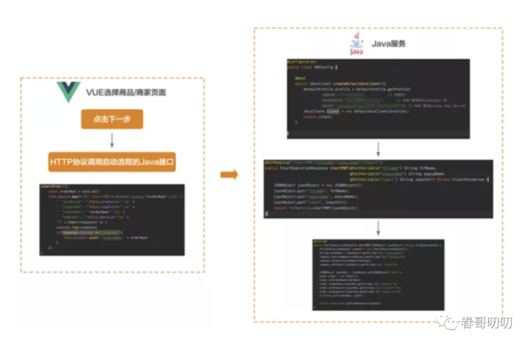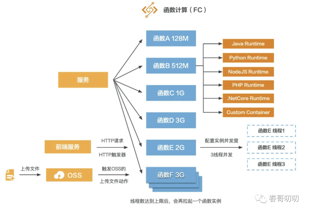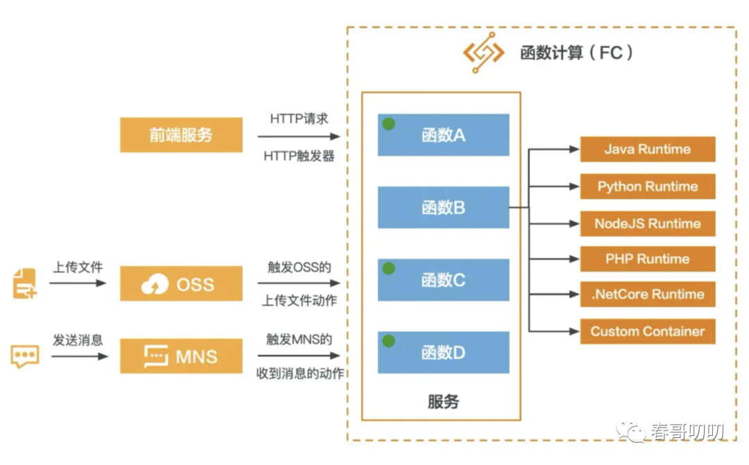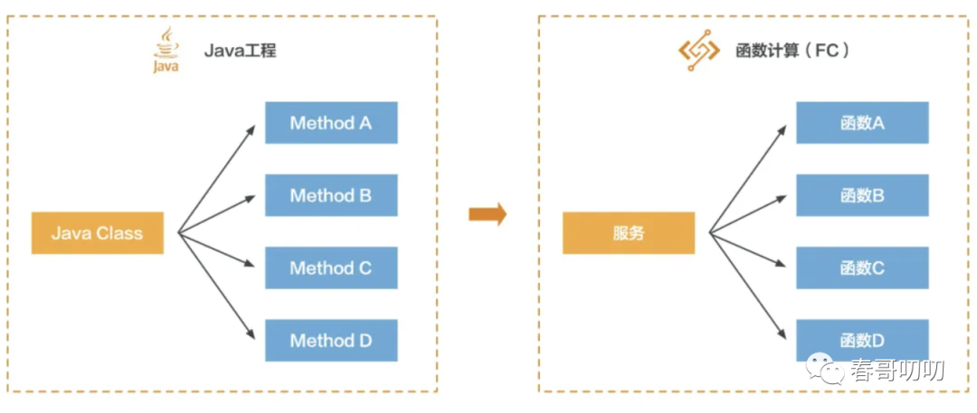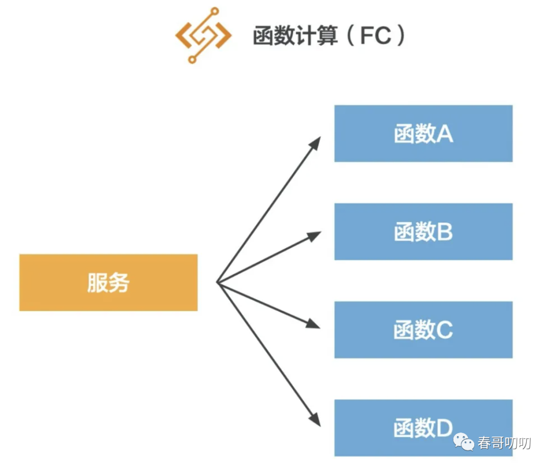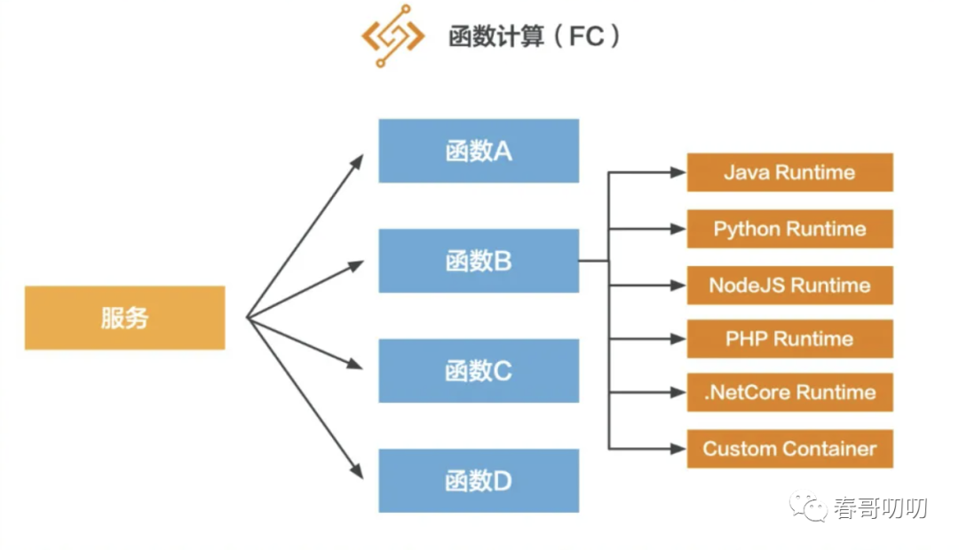 我们可以用微服务理解,我们通过golang或java搭建了一个微服务架构,而fc服务就是其中的类,fc函数是类中的一个方法: