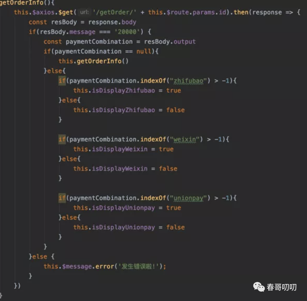 进入该页面后,会请求 Java 服务暴露的接口,获取订单信息,根据支付方式在页面上显示不同的支付方式。代码片段如下: