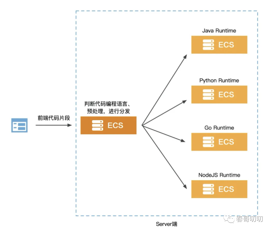 抽象来说,前端只需要将代码片段和编程语言的标识传给Server端即可,等待响应结果。Server端可以针对于不同编程语言进行runtime分类、预处理等工作。
