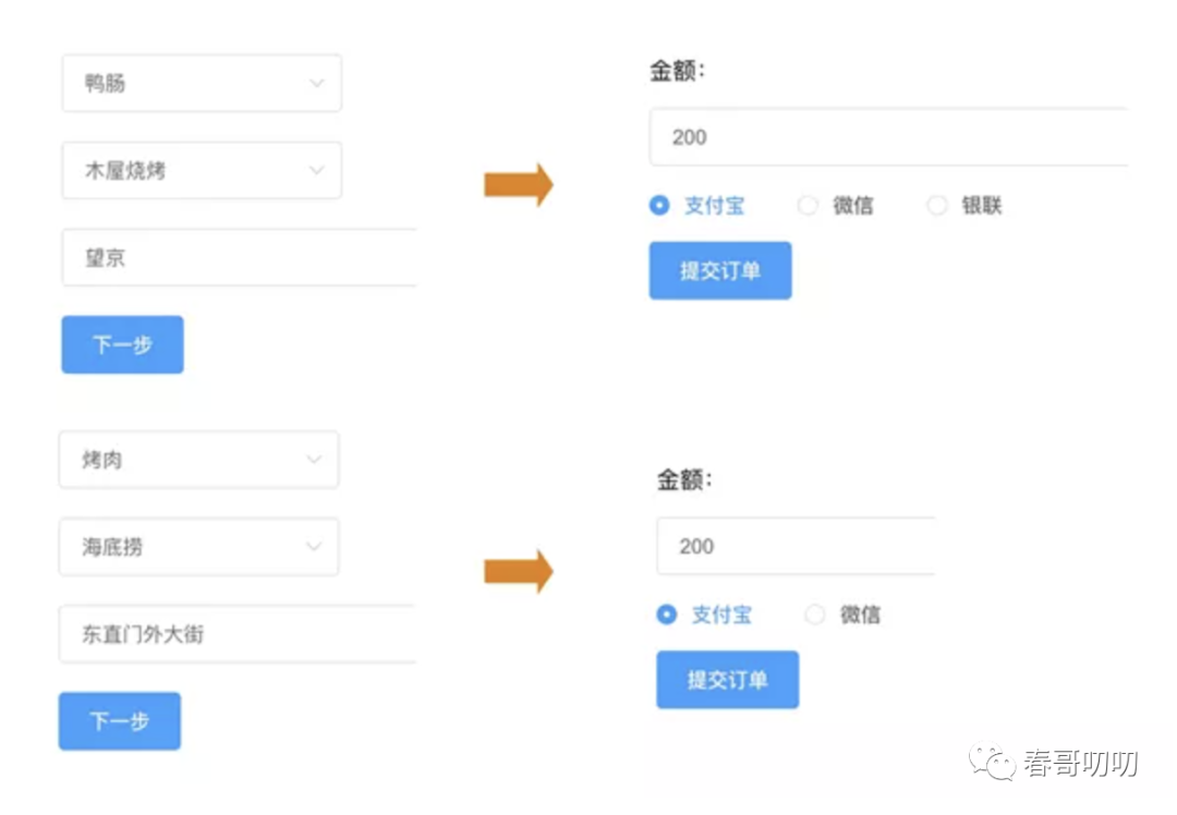 在实际项目中,需要将可定制的部分抽象为元数据描述,需要有配置界面供运营或商家定制支付方式也就是元数据规则,然后前后端页面基于元数据信息展示相应的内容。