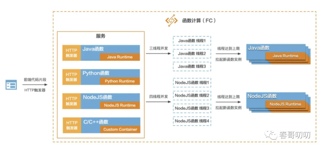 给函数设置并发实例数,比如3个,那么当有三个请求进来时,该函数只启动一个实例,但是会启动三个线程来运行逻辑;
