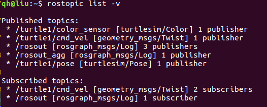 使用rostopic list -v 可以查看每一个话题的发布者和订阅者的个数。