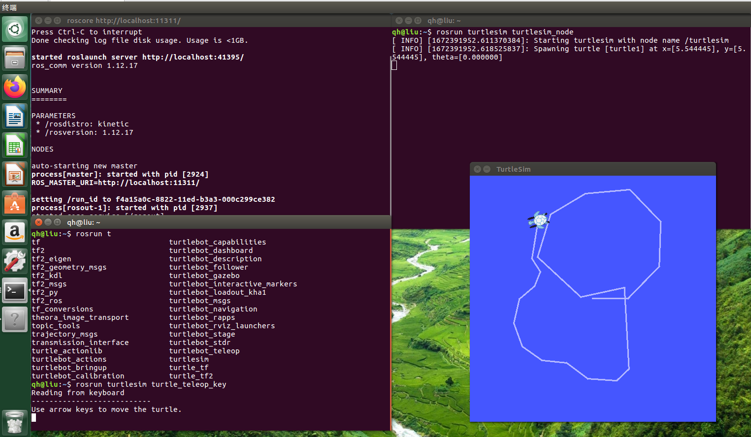 将之前的终端全部关掉,重新按照步骤打开小海龟控制窗口后,打开一个新的终端输入: