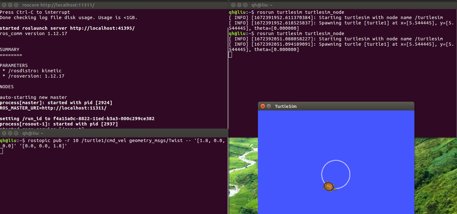 rostopic pub -r 10 /turtle1/cmd_vel geometry_msgs/Twist -- '[1.8, 0.0, 0.0]' '[0.0, 0.0, 1.8]'或
