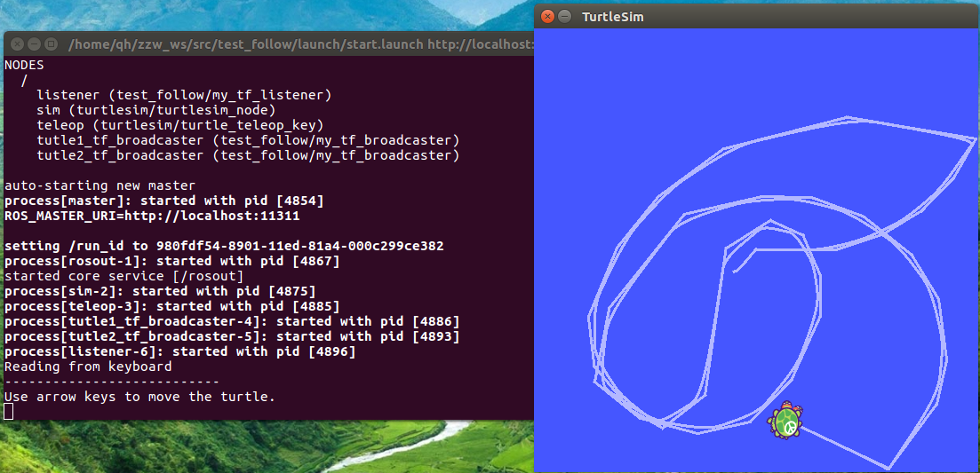turtle_vel.publish(vel_msg);然后,在launch文件中添加监听器与两只海龟的广播器。
