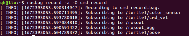 rosbag record -a -O cmd_record保留之前的终端窗口,再创建一个新窗口,输入:~$ rosbag record -a -O cmd_record 开始记录小海龟路径,出现: