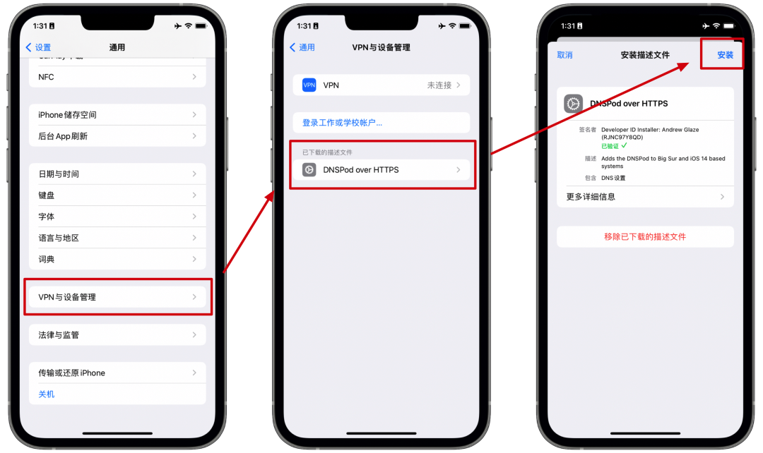 进入设置-通用-设备管理-找到前面安装的名为“DNSPod over”的描述文件,进行删除,然后重启iPhone就可以了,删除描述文件不会删除微信资料,可以放心使用。