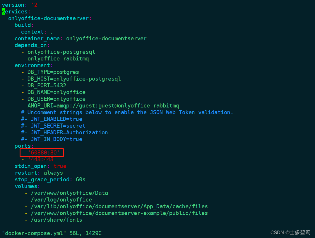 git clone https://github.com/ONLYOFFICE/Docker-DocumentServer进入Docker-DocumentServer文件夹,发现有个docker-compose.yml文件,编辑它,改成你可用的端口,其他配置不建议改,除非你熟悉它:
