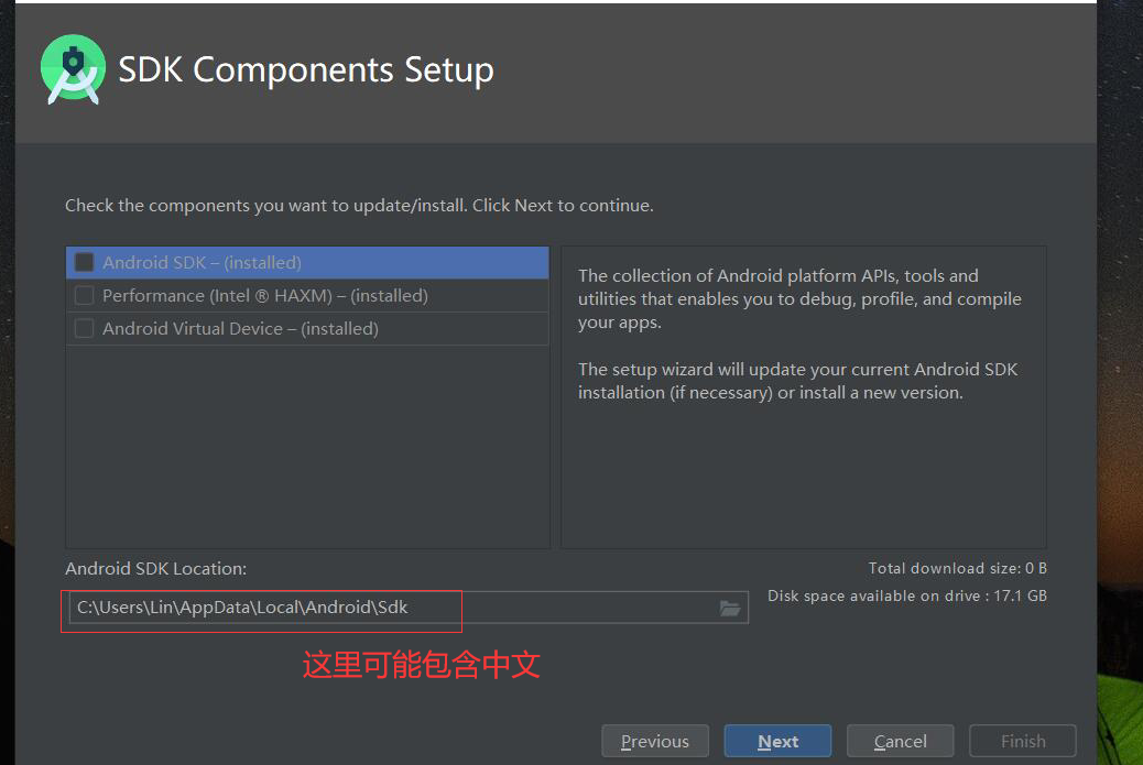 一般网上的教程都是在安装过程中会顺便下载SDK,但是有时候就是死活勾选不了,这时候你要看看下载的路径中是否有中文,如果有中文就改到其他没有中文的路径里面,然后稍等一会儿就可以勾选了