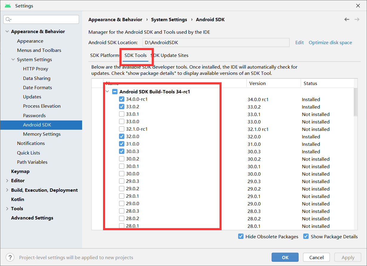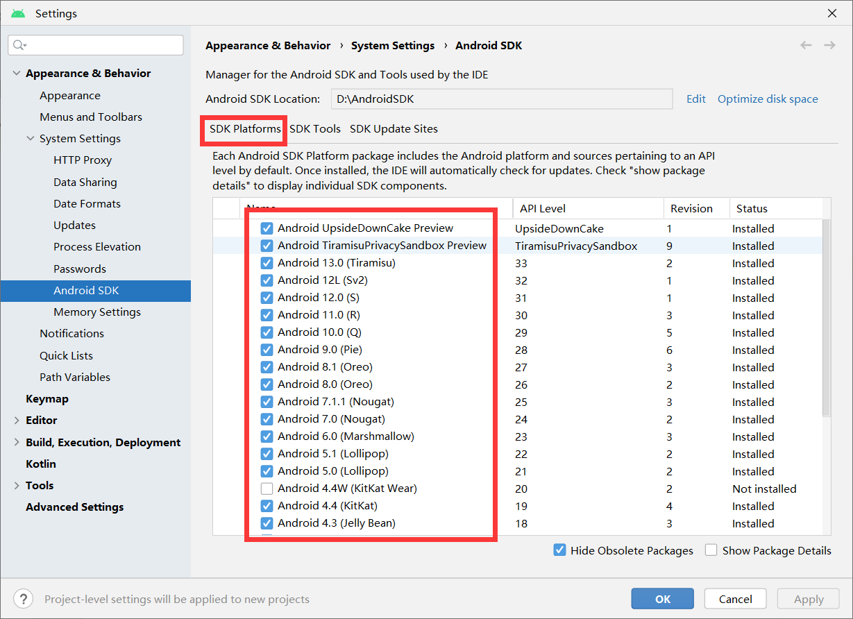 接下来会出现这个界面,在SDK Platforms中,如果电脑硬盘空间充足可以都下载下来,如果空间紧张,就下载7.0以上的就行