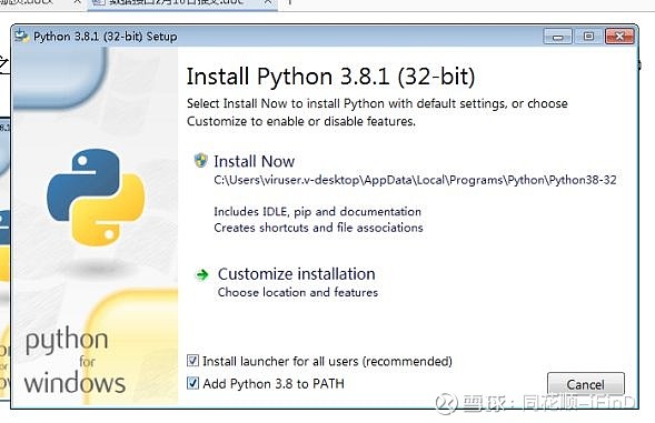 点击之后,会下载exe的32位Windows系统安装包(如果需要别的版本和支持其他系统的python可以在官网上找)。打开之后,请勾选下面的两个待选框。点击第一个按钮Install Now,并记住默认的安装路径。
