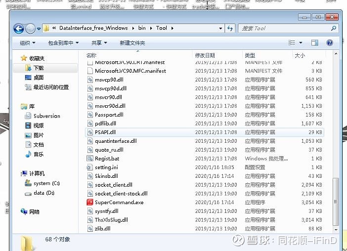 那么如何使用同花顺数据接口提取数据呢?如果您是iFinD用户,前往网页链接 下载免费版数据接口。下载完成后,会出现一个DataInterface_free_Windows_20200116.7z 的文件,解压到任意文件夹中。打开该文件夹进入Bin文件夹后,再打开Tool文件夹,双击运行SuperCommand.exe,并使用iFinD账号免费登录。