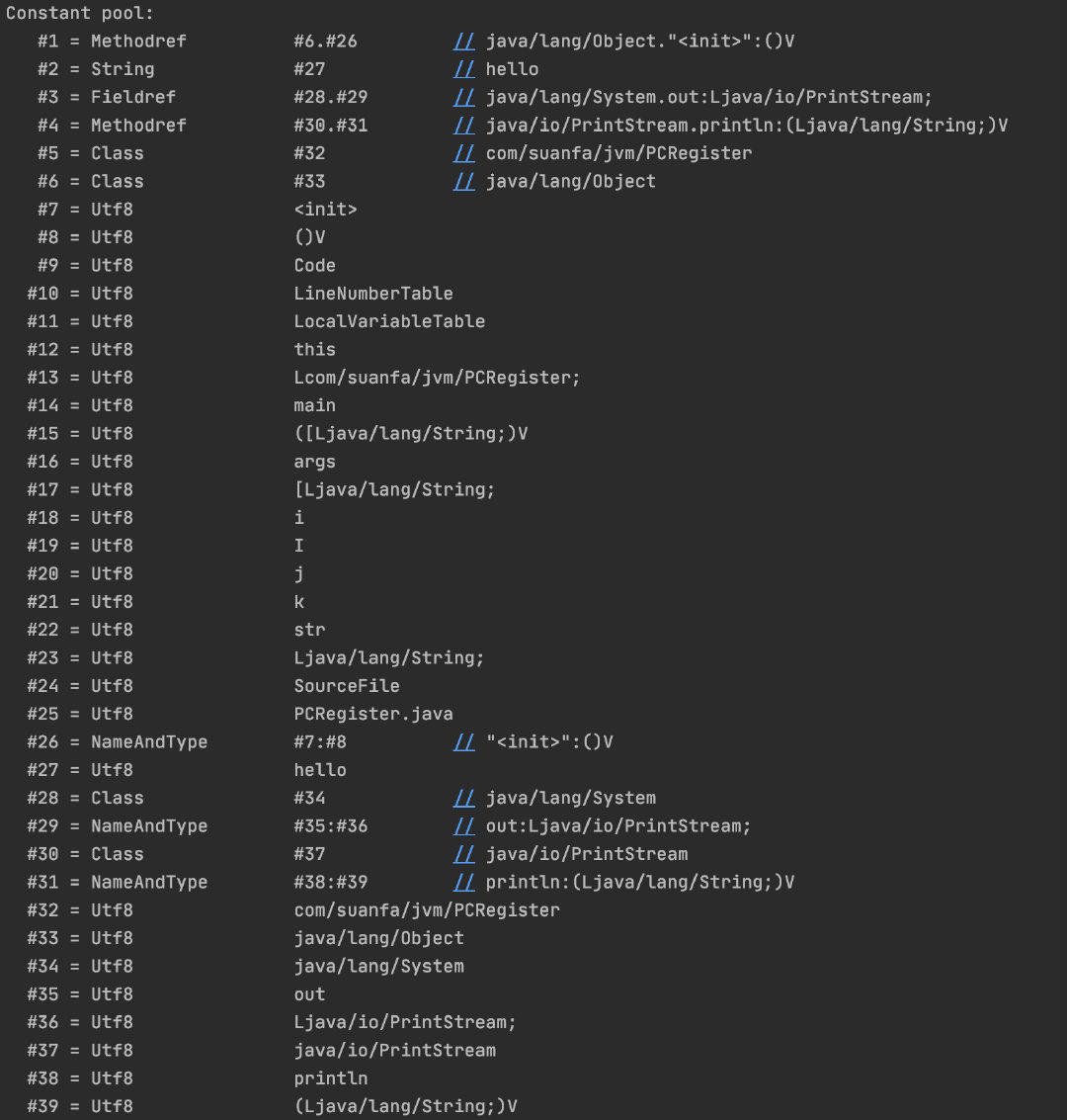 #28对应的是Class 找到#34 我们可以看到是java.lang.System,#29对应了#35,#36,也就是out和printStream。