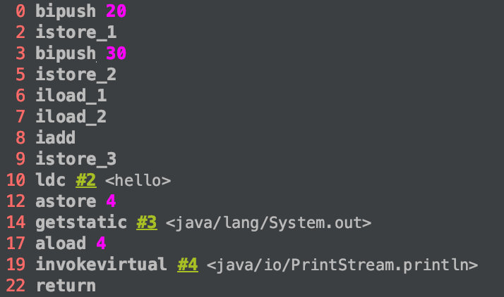 前面操作比较简单,其实就是将常量值20压入栈然后存入索引1的位置,然后将常量值30压入栈然后存入索引2,然后取出1,2,相加之后存入索引3。