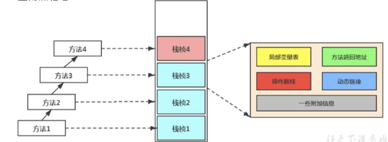 如果在该方法调用了其它方法,对应新的栈帧就会被创建出来,压栈后成为新的当前栈帧。