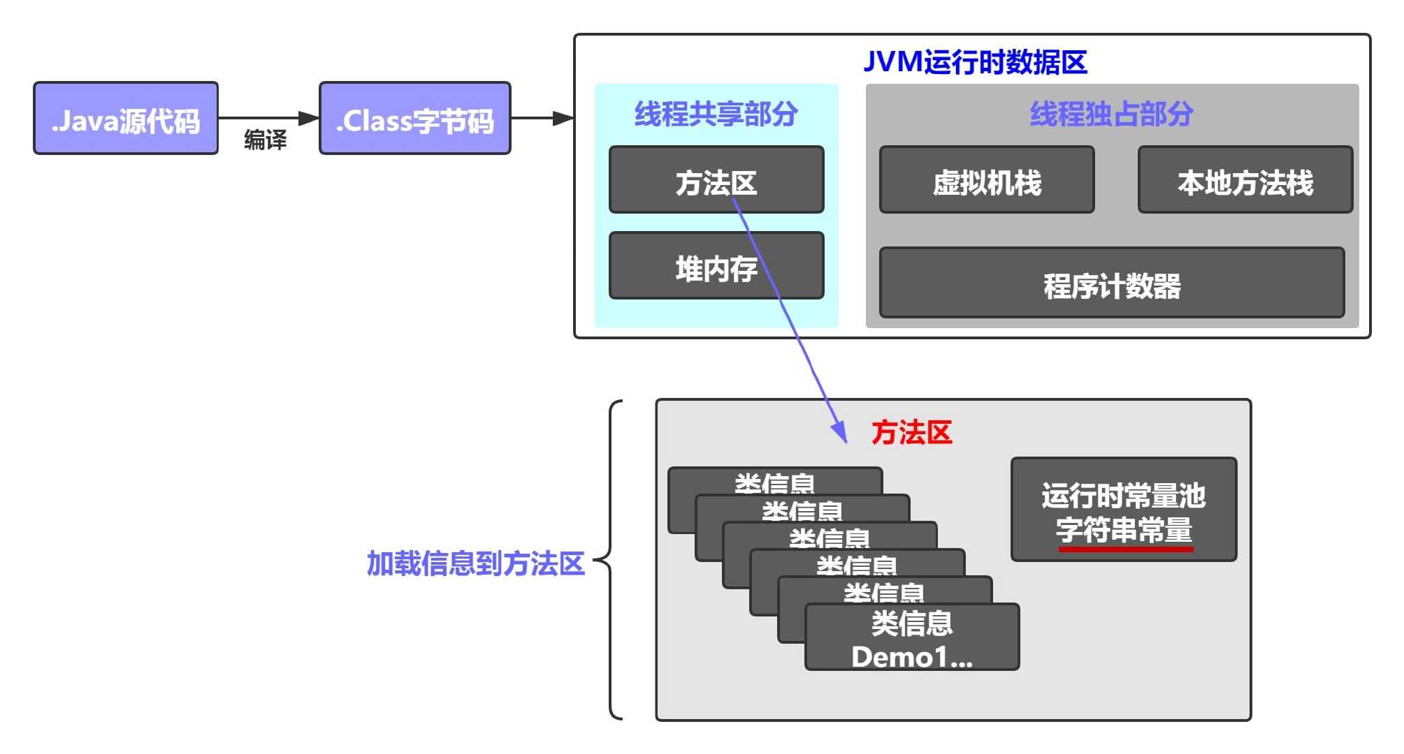 方法区同 Java 堆一样是被所有线程共享的区间,用于存储已被虚拟机加载的类信息、常量、静态变量、即时编译器编译后的代码。更具体的说,静态变量+常量+类信息(版本、方法、字段等)+运行时常量池存在方法区中。常量池是方法区的一部分。