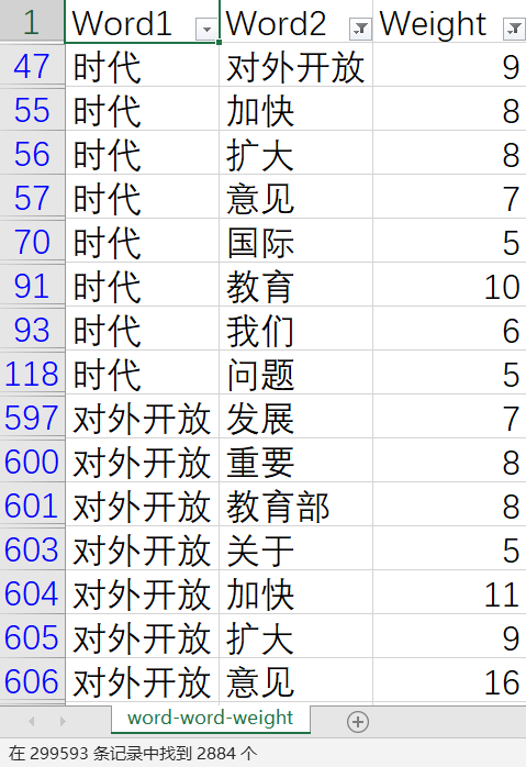 将文本共现矩阵存入"word-word-weight.csv"文档中,共有 299593 条数据,但其中有大量权重较低的词组对,因而还需要进一步筛选,此时将 Weight 低于 5 的数据都过滤掉,还剩 2884 条数据。