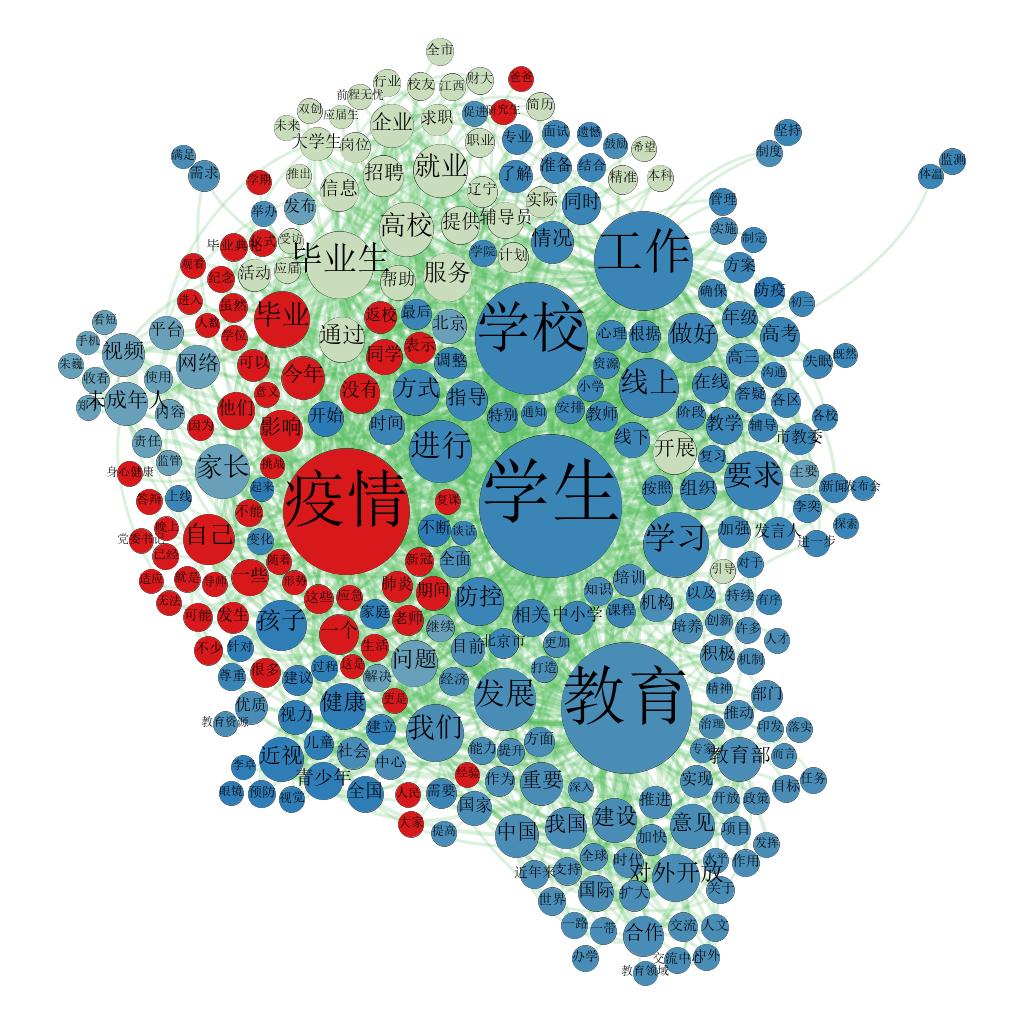 从主题词图谱可以看出来,前十大关键词为学生、教育、疫情、学校、工作、毕业生、学习、发展、线上、要求。其中有八个词汇为蓝色,词汇“疫情”为红色,词汇“毕业生”为浅绿色。从中可以发现,深蓝色区域对应主要话题为学校教育、社会热点话题以及与国家宏观政策相关的关键词,浅绿色区域对应主要话题为毕业求职相关的关键词,红色区域对应主要话题为与疫情影响相关的关键词,蓝绿色区域对应主要话题为与青少年发展相关的关键词。