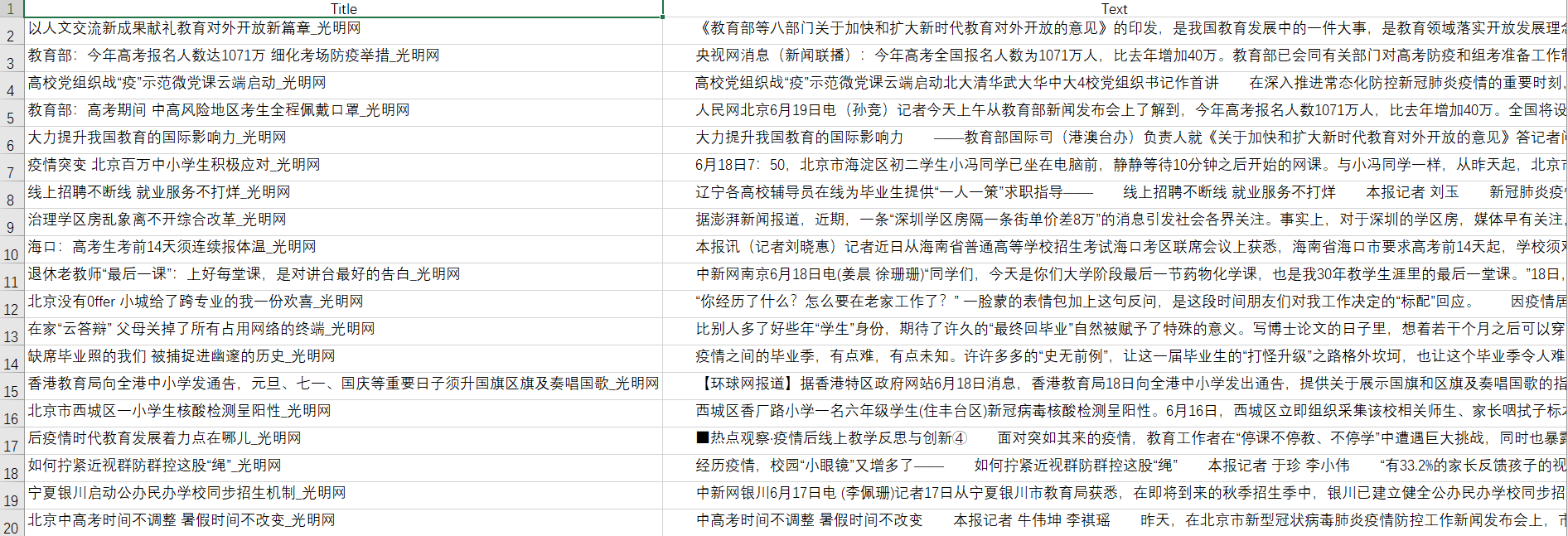 此处需要注意的是,首先由于文档需要后续进行关键字提取,所以保存为 txt 文件“D:/data.txt”,又为了便于之后共建矩阵的使用,也保存一份 CSV 文件。同时,因为数据量较大,不便于一次性爬取全部所需内容,此处均采用追加模式。