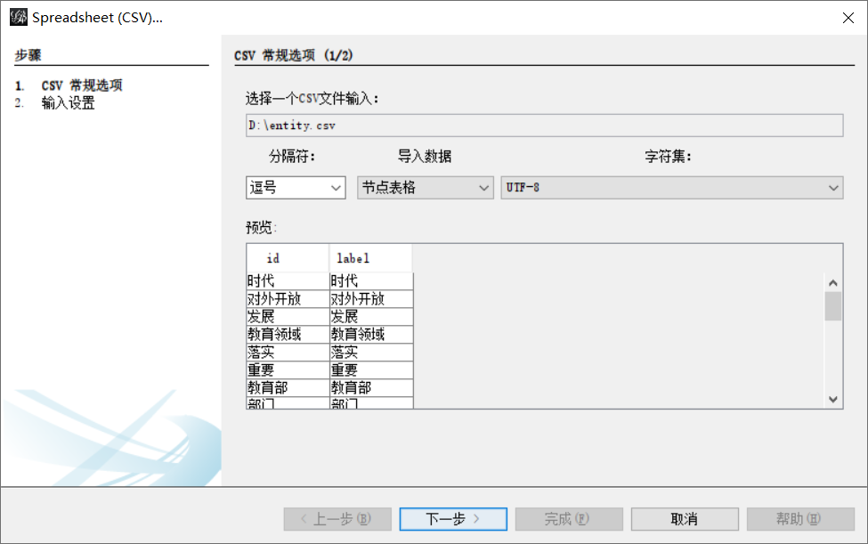 新建 CSV 文件"entity.csv",将"word-word-weight.csv"文件中的 word1,word2 提取出来,去重,共得到 744 个顶点。