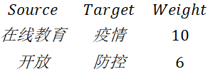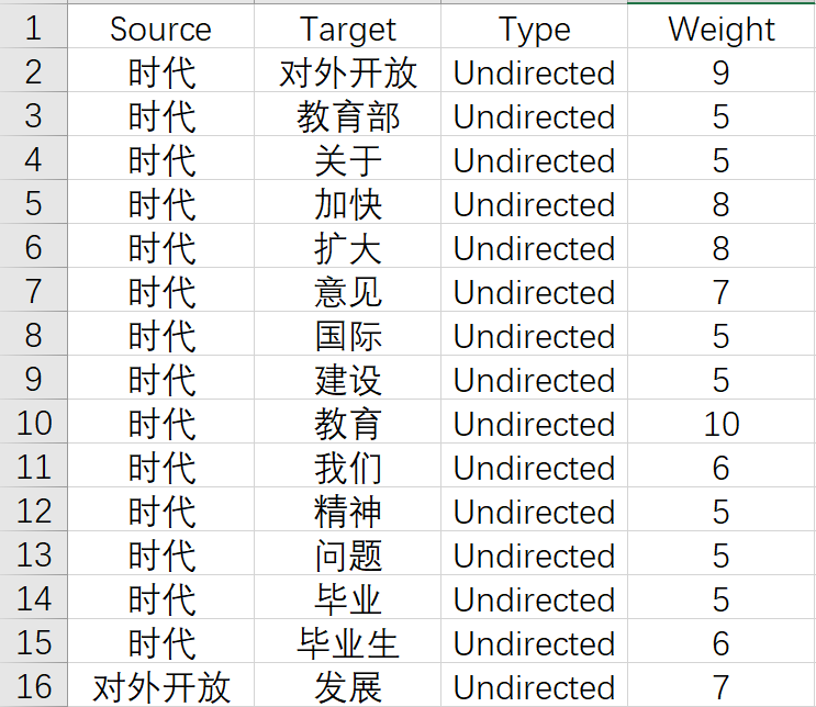 在已获取的"all-data-key.txt"文件中,每一行存储了一则新闻的前 50 个关键词,可以将不同文章的关键词整合构造一个共现矩阵,通过关键词的配对次数来分析大数据下近日教育的热点词。将词组分别记为 Source 和 Target 便于之后 Gephi 绘图,同时 Weight 记录权重,可以使图像更为直观。下为文本共现矩阵的形式示例。