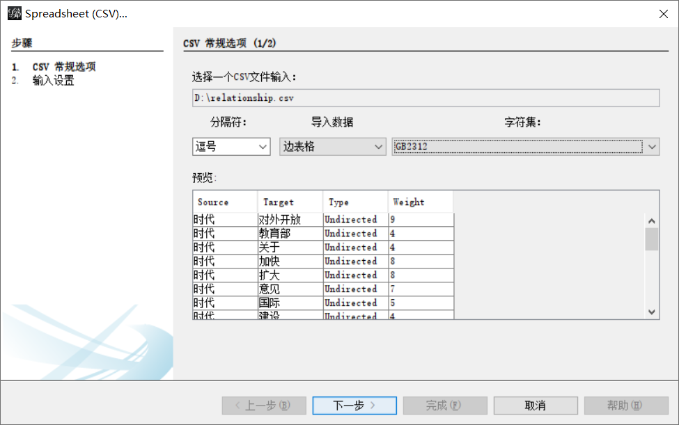 新建 CSV 文件"relationship.csv",将"word-word-weight.csv"文件中的 word1,word2 以及 weight 提取出来,并添加属性"Type"为"Undirected",便于之后在 Gephi 中构建无向图。