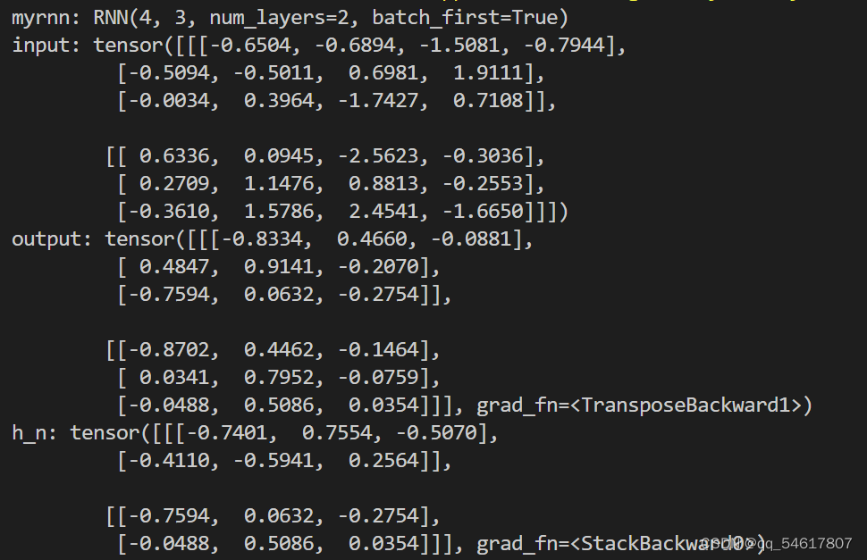 output, h_n = myrnn(input) #output为每个时刻的隐藏状态,格式为(batch_size,sequence_length,hidden_size);h_n为最后时刻的隐藏状态,格式为(num_layers,batch_size,hidden_size)