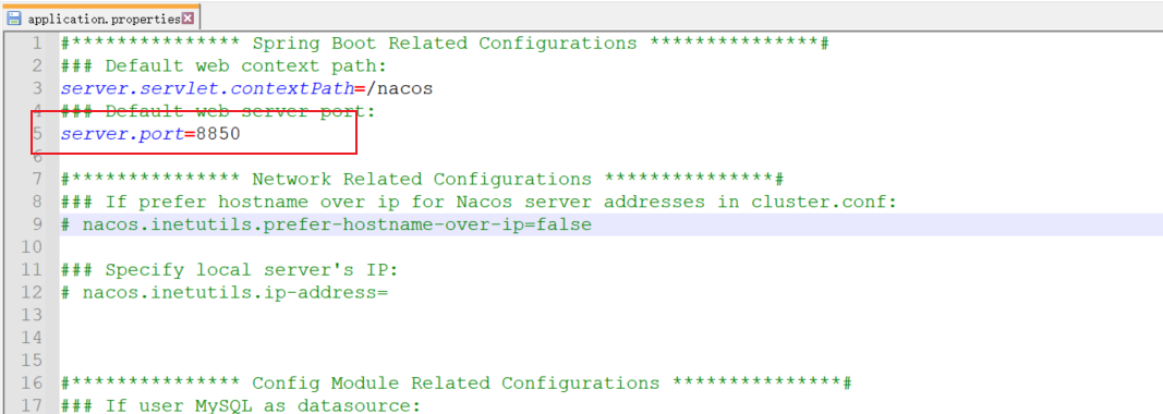 Nacos默认的端口号是8848,那么如何修改端口呢?只需要修改conf目录下的application.properties中的server.port即可,如下图: