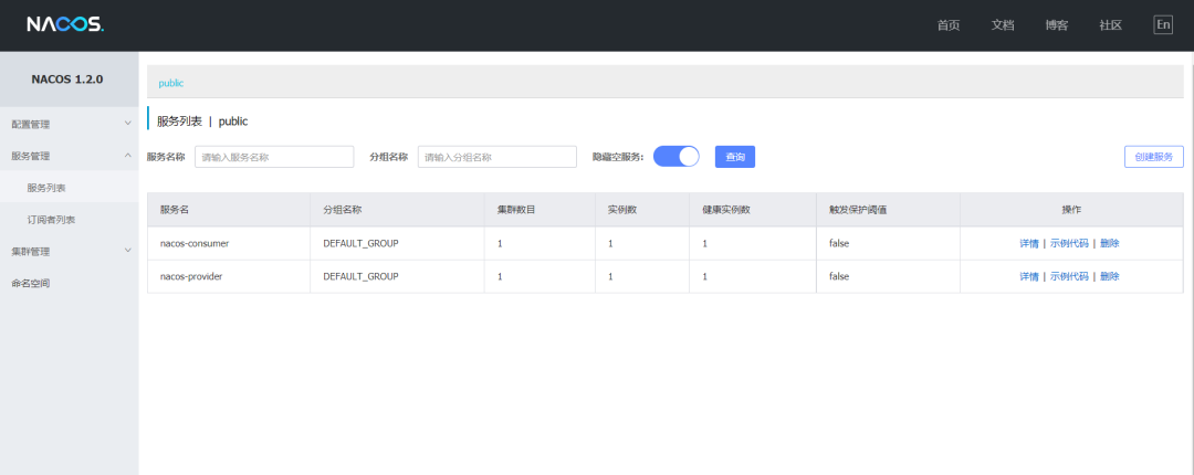 启动成功之后将会在nacos中的服务列表中查看到两个服务,分别是nacos-provider、nacos-consumer,如下图: