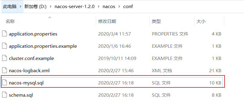 首先在Mysql中新建一个数据库nacos-config(名称随意),然后执行Nacos中的SQL脚本,该脚本是Nacos-server文件夹中的nacos-mysql.sql,如下图:
