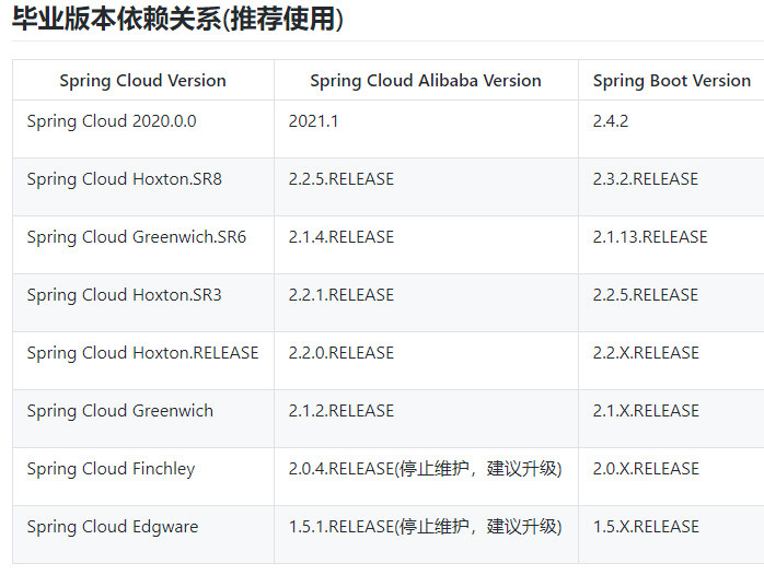 注意:Spring Boot、Spring Cloud、Spring Cloud Alibaba的版本可不是随便选择的,官网明确规定了各个版本的适配:https://github.com/alibaba/spring-cloud-alibaba/wiki,如下图: